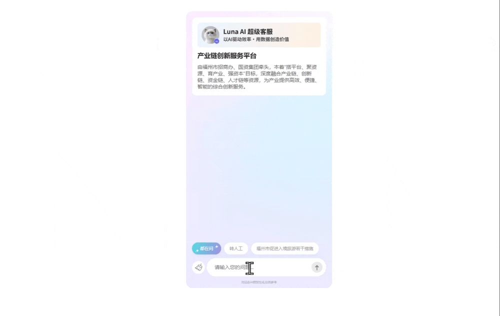 以改变客户服务的方式,将AI能力整合到企业业务中,为企业赋能,以较低的成本和时间加速企业智能化转型的变革,全触点服务、全场景覆盖、全业务闭环、一体化平台、统一化数据,全面帮助企业做好“营、销、服”环节中的客户联络业务。此次LUNA AI携手福州榕投,共同打造全国首个招商 Agent,不仅是科技赋能招商的新探索,更是区域战略发展与智能化时代深度契合的重要实践。科技与城市的双向奔赴,让“智引榕城、共绘新篇”成为现实,为福州市招商引资注入强劲 AI 动力,为全国智慧招商树立新标杆。