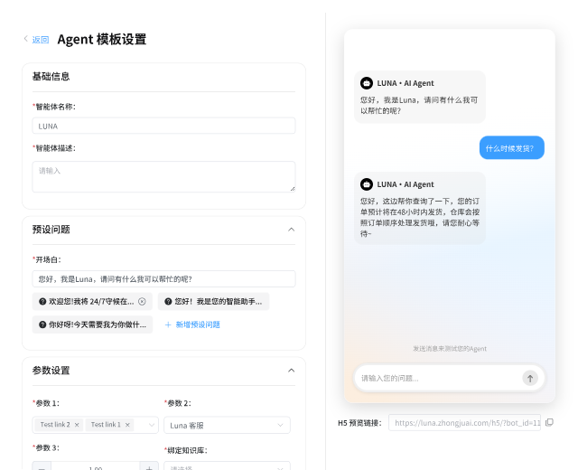 LUNA AI 内置 300+ 训练优秀的全行业智能体,一键配置即可快速部署专属 AI 客服团队,助您高效转化客户。